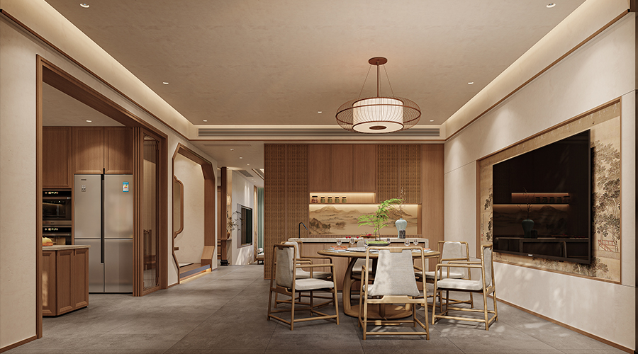 廚房是空間的“心臟”——原有封閉式格局被半開放設(shè)計替代,隱藏式推拉門成為巧妙的“開關(guān)”:閉合時保留烹飪的獨立與整潔,推開后則徹底消融邊界,讓廚房、餐廳、客廳連成一片通透的洄游場域。陽光從窗戶漫入時,烹飪的香氣、孩子的笑聲、客廳的光影能自由穿梭,生活的煙火氣由此變得舒展。
